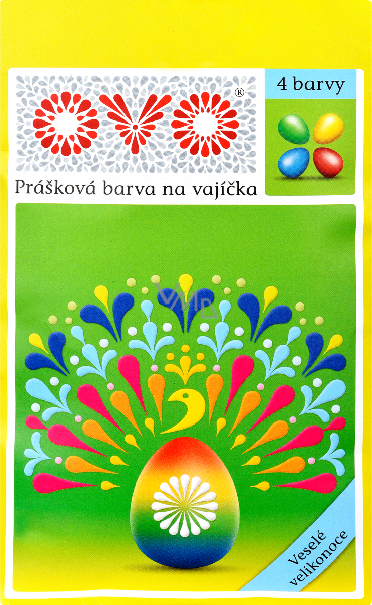 Čtyři práškové barvy (žlutá, červená, modrá a zelená) určené na barvení velikonočních vajec.